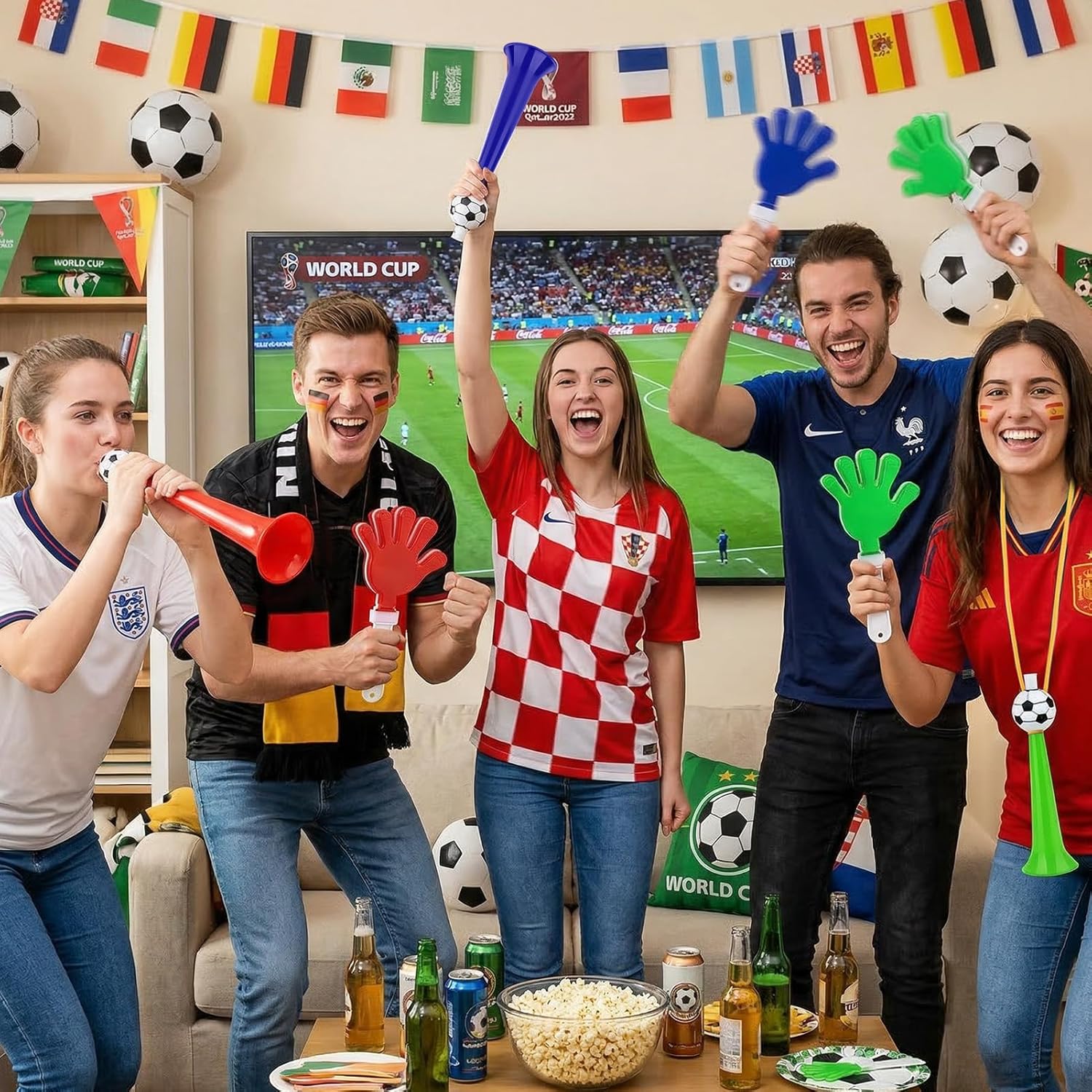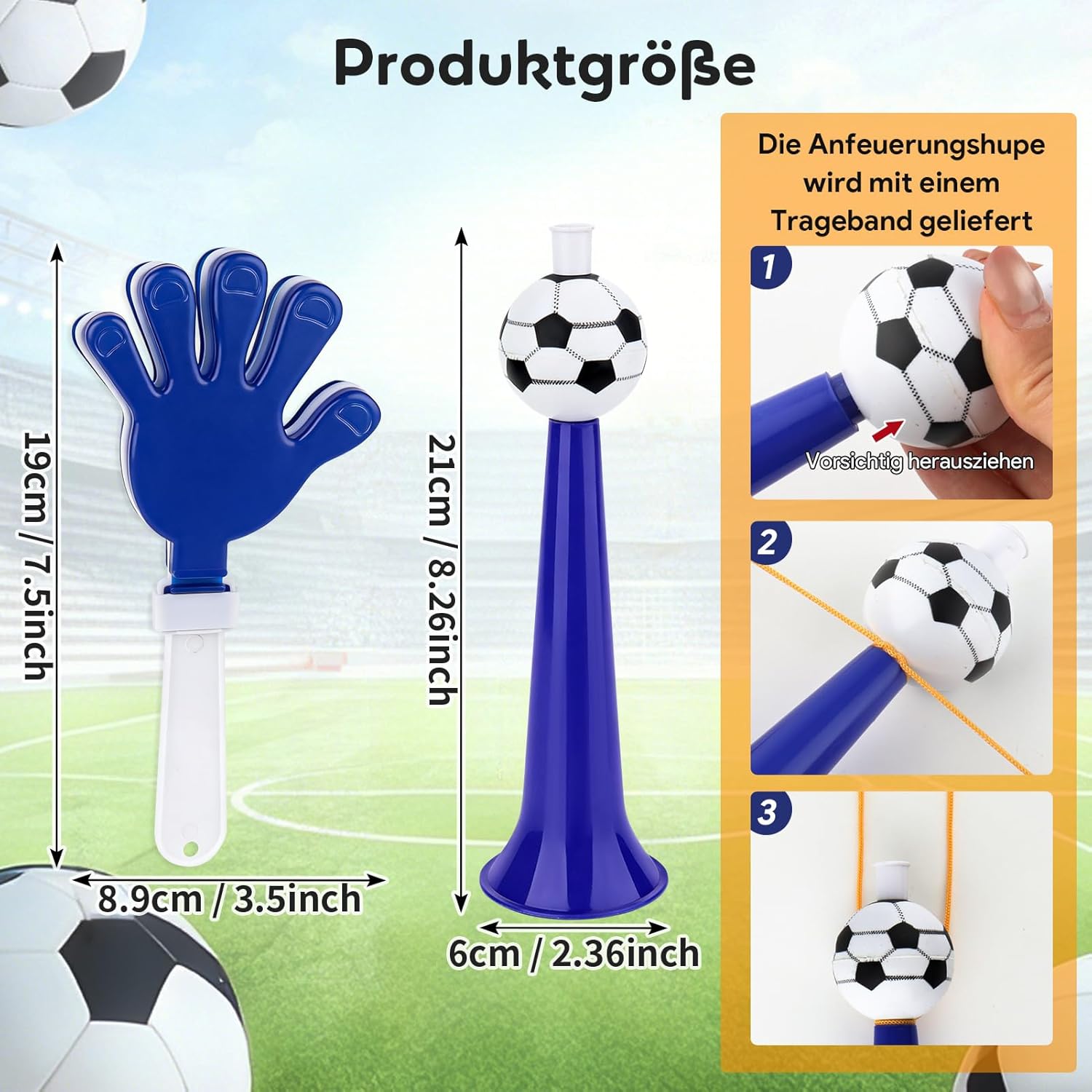 Features: 1. The horns are pressure-stable and the clapping hands bend resistant, both made of wear-resistant and shock-resistant material. They can withstand intensive use at family gatherings or fan parties and do not break easily. 2. Simply blow into the horn for instant sound or beat your gossip hands together - no complicated steps required. Both adults and children and passionate fans can use them effortlessly, making shared public viewing more fun and inclusive. 3. Each horn has a hanging bracket, and the gossip hands easily slip into bags or backpacks. Perfect for World Cup Public Viewing or Outdoor Events - Always ready to use, anytime, anywhere.