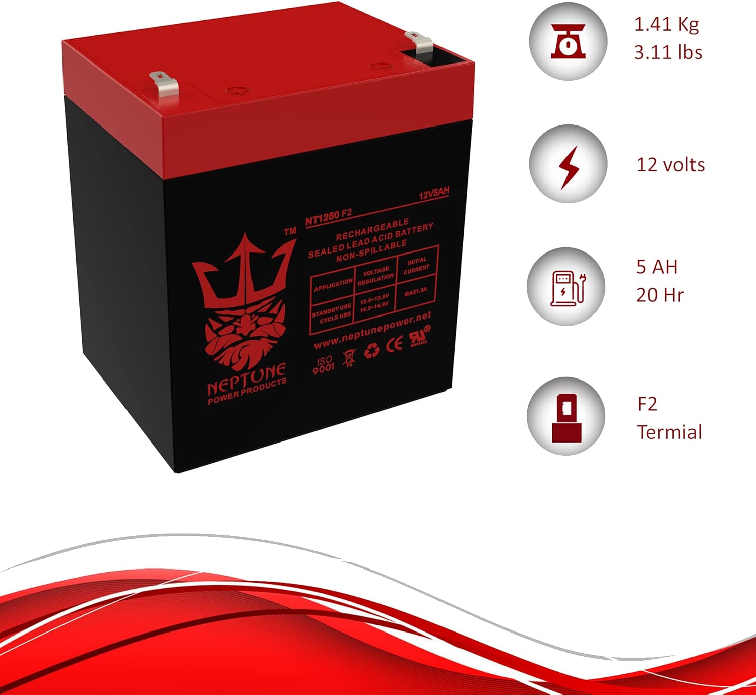 12 Volt 5 Amp-Hour Sealed Lead Acid (SLA) batteries with F2 Terminals by Neptune Power Products are constructed with lead calcium alloy and absorbed glass mat AGM technology which allows a completely maintenance-free and high-performance operation. Fiberglass mat separators and high cell compression extend battery life by delivering superior vibration resistance from the most extreme conditions. All 12V 5Ah Neptune brand AGM batteries are manufactured with the highest quality materials and rigorously tested to ensure safety, OEM compatibility, effectiveness and optimal performance.NT1250 F2 12V 5Ah Battery Features:Patented sealed post prevents corrosion which gives extended battery lifeNo spills, no leaks, and no water to checkExtreme vibration resistance to ensure maximum conductivityHigh Cranking Amps and Low Self-Discharge RateReady for Immediate UseNT1250 F2 12V 5Ah Battery Specifications:Model: 12V5AH SLAVolts: 12VPolarity: [+ -]Terminal Type: F2Condition: New