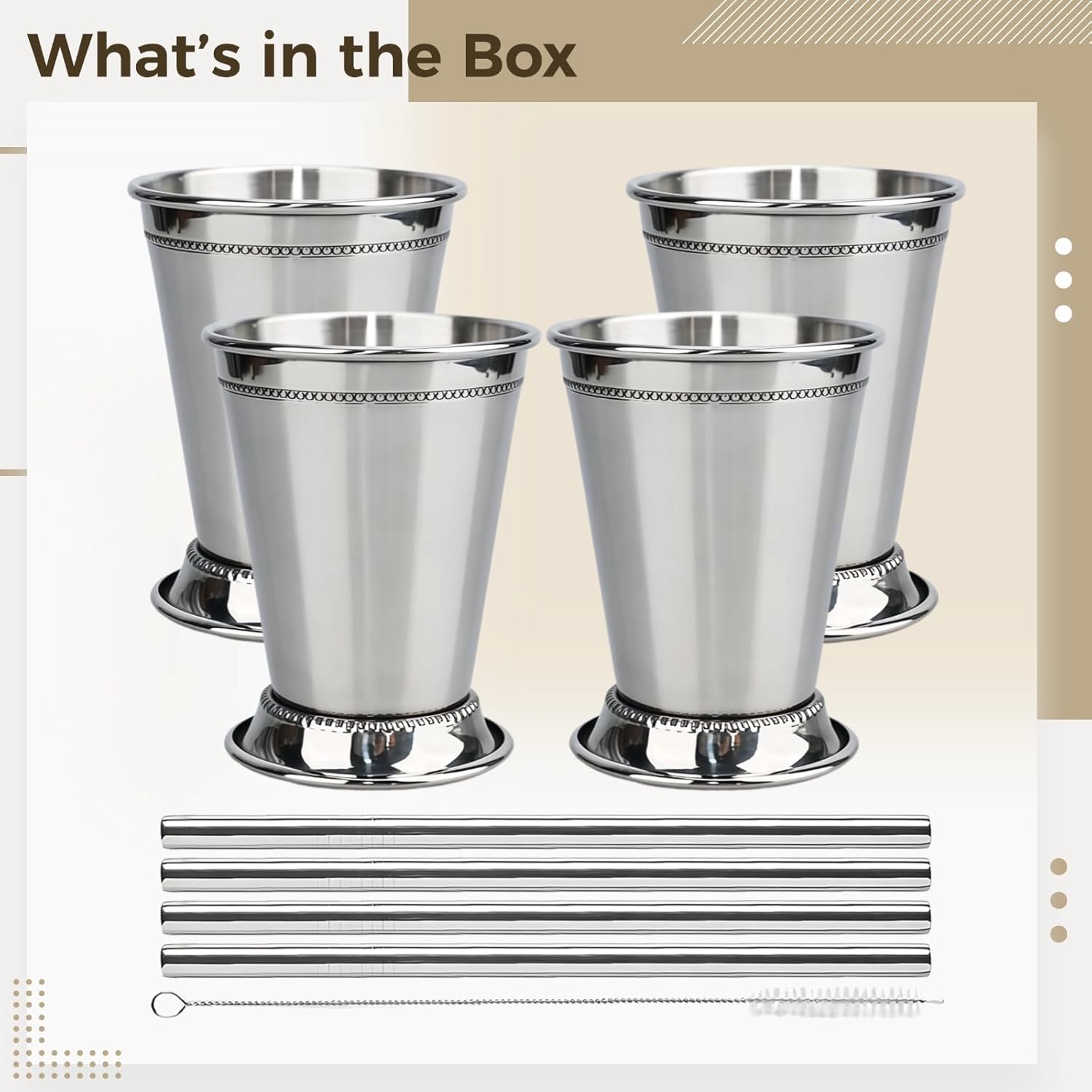 Color:Silver Material:Stainless steel Product Size: opening diameter: 3.74 in / 9.5 cm; height: 4.45 in / 11.3 cm Package Includes:Cups*4, straws*4, brush*1 Note: - Please refer to the measurement. Tiny measuring error is allowable in normal range. - There might be a little color difference due to the monitor, camera or other factors, please refer to the physical item.