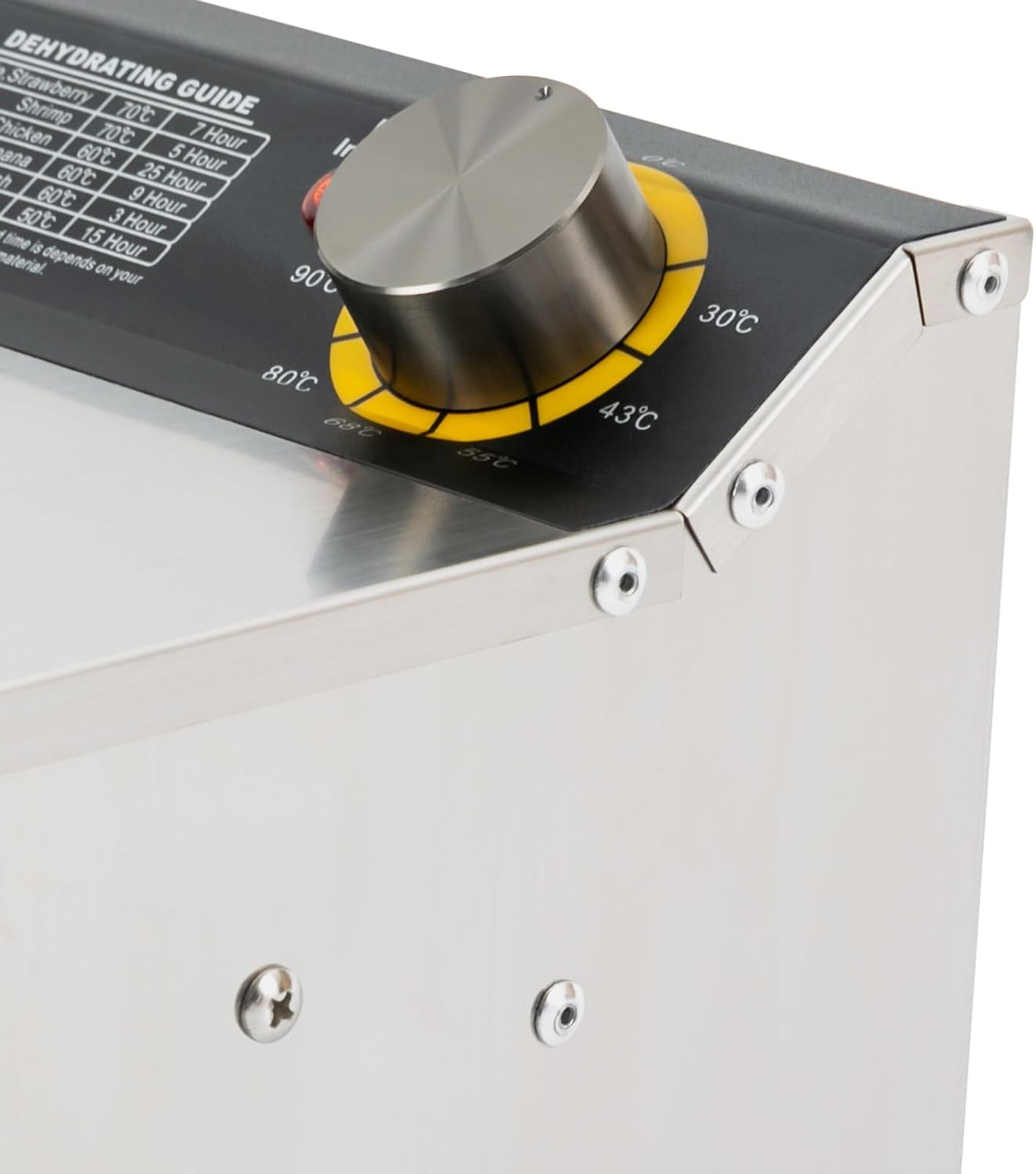 ApplicationThis product is suitable for most kinds of fruits, vegetables, herbs, meat, spices, grains, beans, snacks, cat food, dog food, flowers, etc, It is ideal for kitchens, restaurants, bakeries, cafes, fruit shops, snack shops, and other scenes.How to Use1. Wash and slice food.2. Load them evenly on the tray.3. Set the time and temperature.SpecificationsColor: SilverShape: RectangularStyle: Modern Material: 201 Stainless Steel, 304 Stainless Steel, Glass, Aluminum Alloy, RubberProcess: PolishingControl Method: KnobsAssembly Required: YesMount Type: CountertopPower Source: Corded ElectricPlug Type: US StandardVoltage: 110V, 60HzPower: 400WTiming Range: 0-12HPower Cord Length: 1m/3.28 ftNumber of Grid Trays: 6 Temperature Range: 30-90℃/86-194℉Noise: About 50dBLoad-bearing Capacity of Each Grid Tray: About 0.5-1kg/1.1- 2.2 lbsEach Grid Tray Size: 28.5*20cm/11.22*7.87 inTray-tier Spacing: 2.5cm/0.98 in Gross Weight: 5kg/11.02 lbsNet Weight: 4.2kg/9.26 lbsProduct Size: 29*30*21.5cm/11.42*11.81*8.46 inPackage Size: 35.5*35*27cm/13.97*13.78*10.63 inPackage Included1* Food Drying Machine1* English Manual6* Grid Trays1* Power CordOther Installation AccessoriesNotes1. Please read the manual carefully before use and set the drying temperature and time according to the actual food. 2. Please do not touch the machine and grid trays directly with your hands after use.3. The smell of stainless steel on the brand-new machine is a normal phenomenon. Please open the machine door for 1-3 days to dissipate the smell.4. Please note that the product does not include any food.5. Please allow the slight color difference caused by the shooting light and 1-3cm error due to manual measurement, and make sure you do not mind before you order.