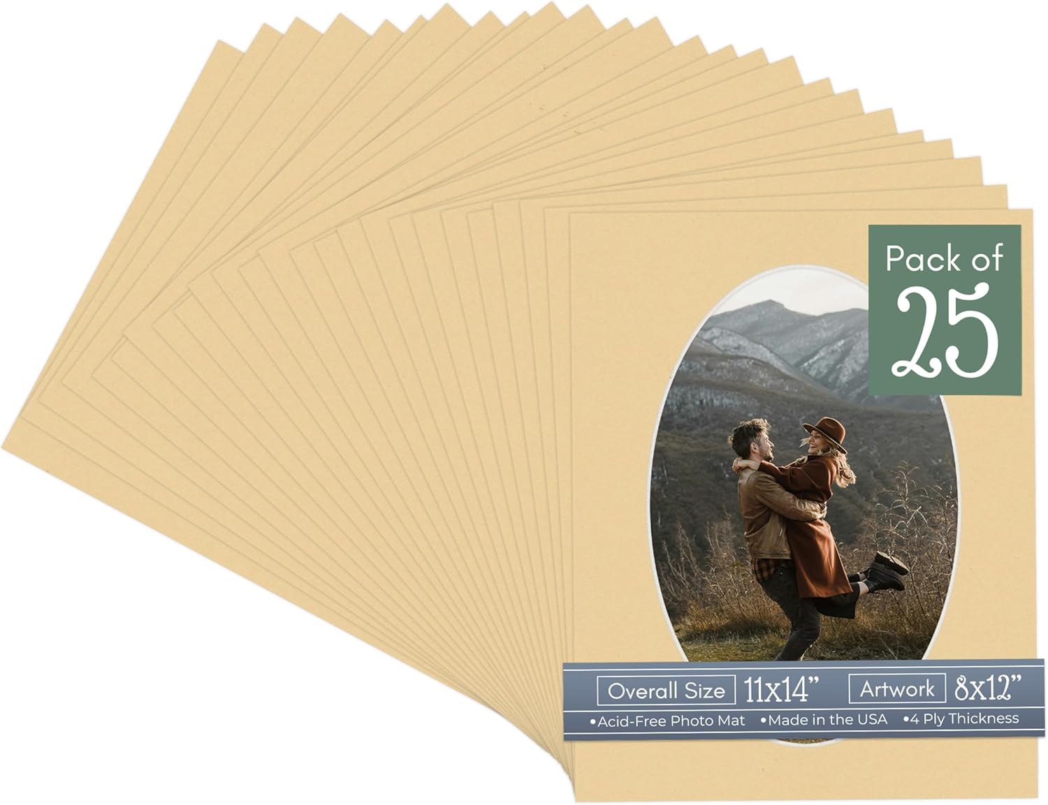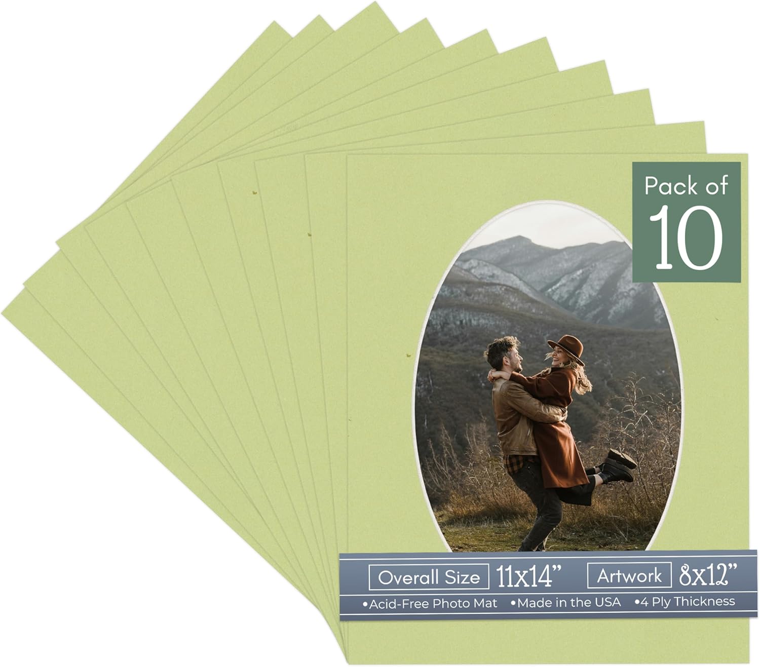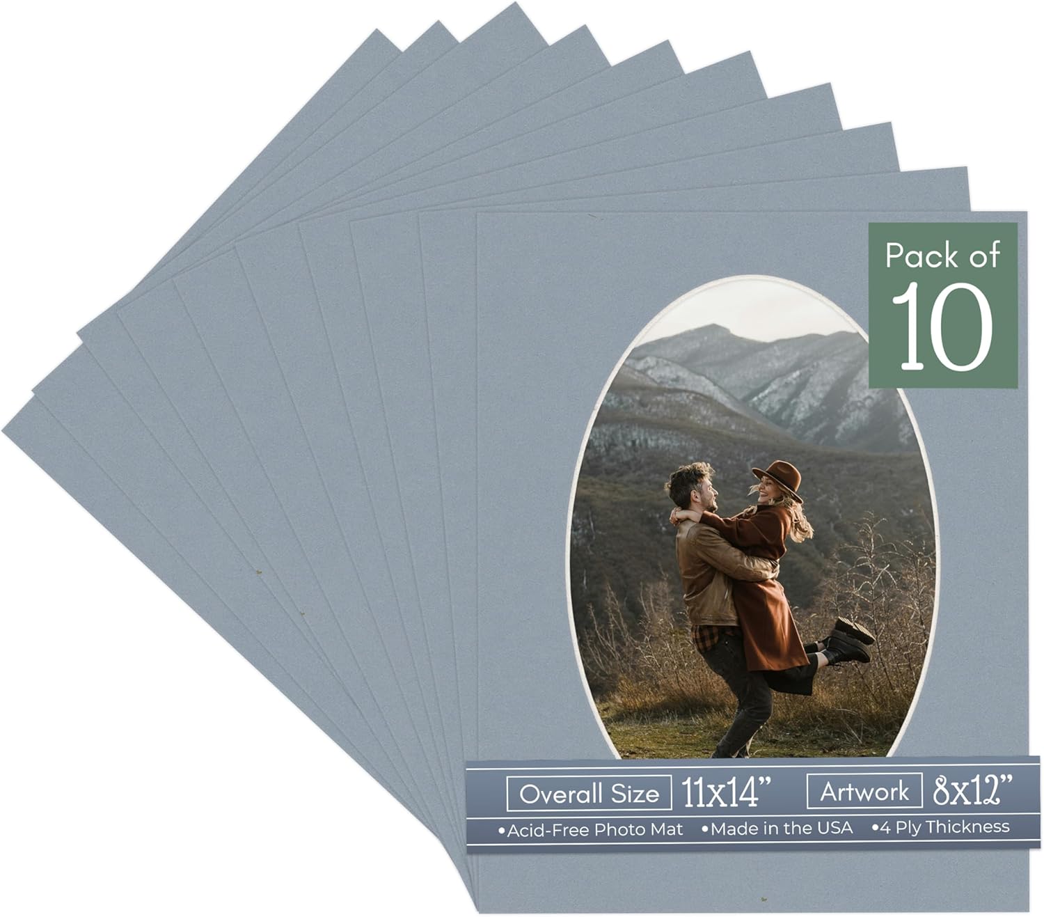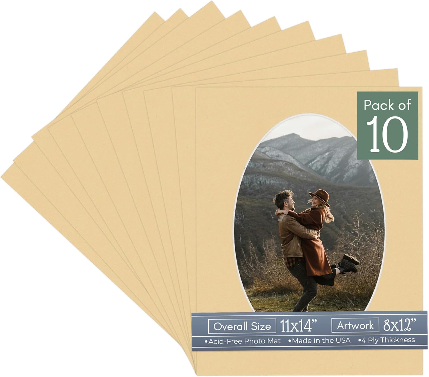 Our acid-free Fresh Linen Canvas matboards are 4-ply and feature a white core. With an overall size of 11x14, these mats with Oval openings fit perfectly into 11x14 frames and are bevel cut to showcase your 8x12 photos. Actual mat opening size is 7.5x11.5 inches so that it may safely and securely house your 8x12 photo, artwork, needlepoint, sign, etc. This pack includes 10 Matboards. Proudly made in the USA by Country Art House!