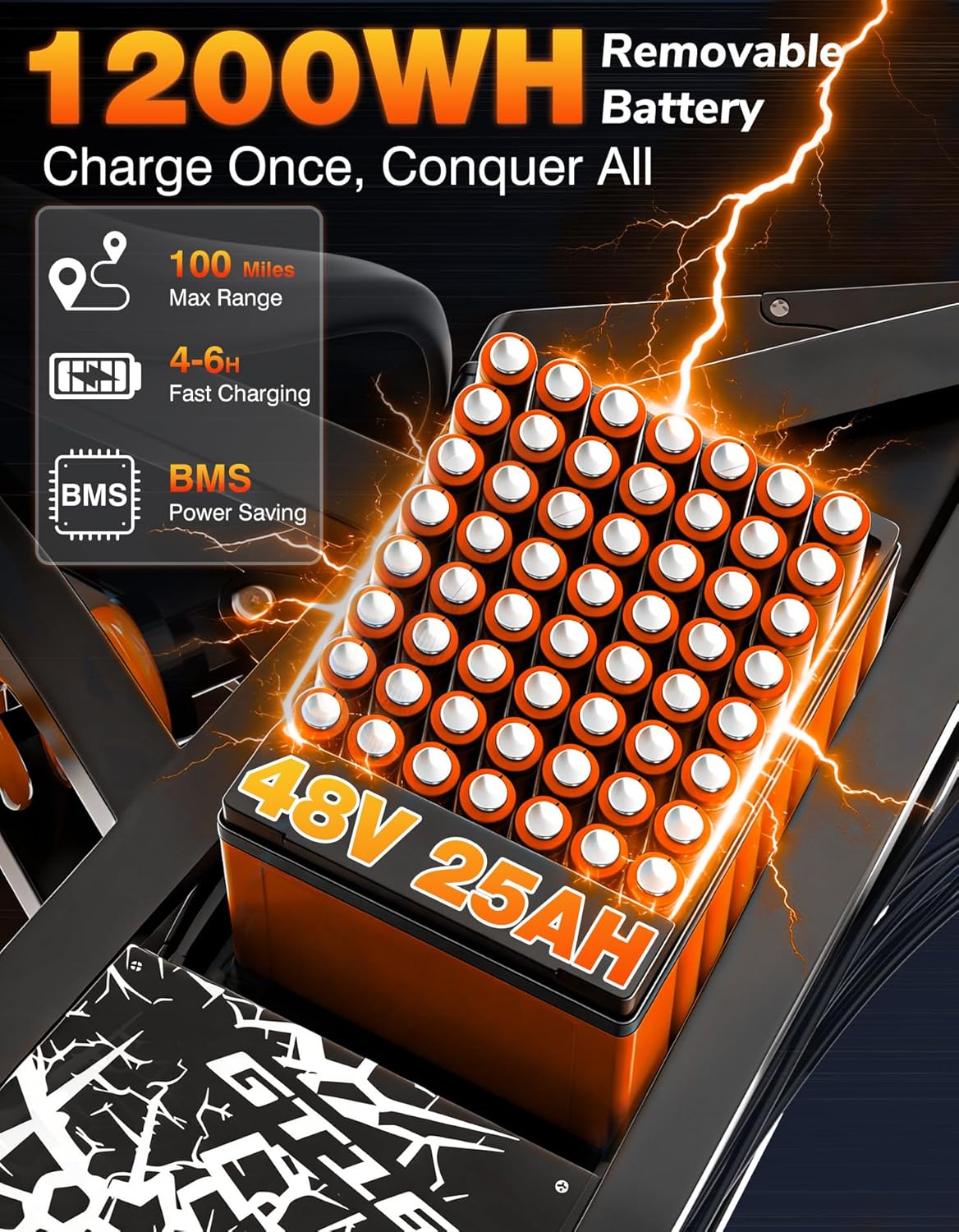 | Additional Features | 16"x 3.0 puncture resistant off-road motocycle tires, 4500W peak power(750W Continuous Power), Up to 40MPH(PAS mode), NFC & password unlock, Dual hydraulic brakes & 203mm rotors, massive stopping power, Full front suspension & mid-mounted rear shock absorber, Removable 1200Wh large capacity battery (48V 25Ah); BMS protection, Max 100 miles range in PAS mode, Up to 80N·m Peak Torque, 45° hill climbing power, 7-speed manual transmission & 5-speed PAS mode |