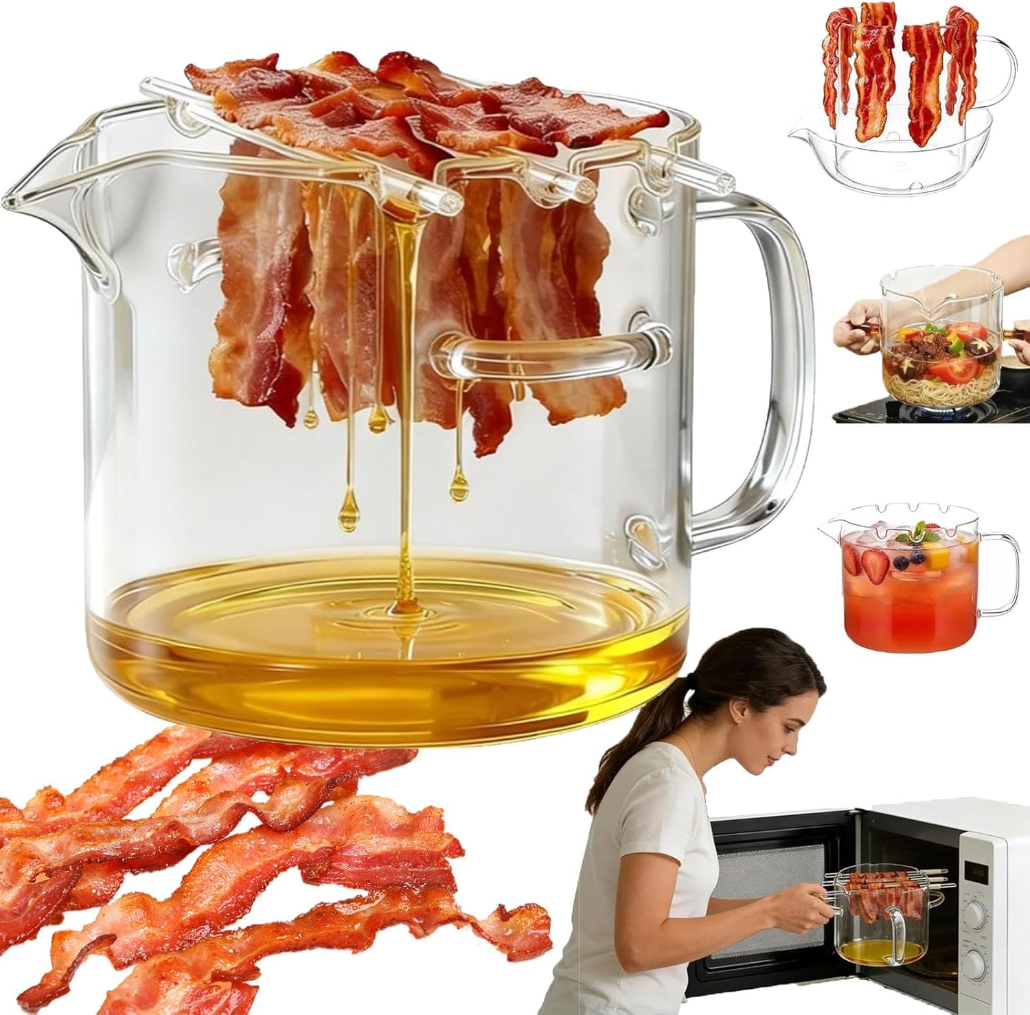 Features: 1. High temperature resistant. 2. Non-stick and easy to clean. 3. Comes with a brush and barbecue tongs. 4. Drop-resistant design. 5. Heat-insulated handle, can be held in any position. 6. Multi-functional. Specifications: Material: High borosilicate glass Capacity: 2.1L/74Oz Uses: Grilling meat, bacon, sausages, etc. Heat resistant: Yes Oil-resistant: Yes Package Includes: 1 PCS * Glass Microwave Bacon Cooker Remarks: 1. Please allow slight size differences due to different manual measurements. 2. Actual color may be slightly different from the picture due to different monitors and lighting effects.