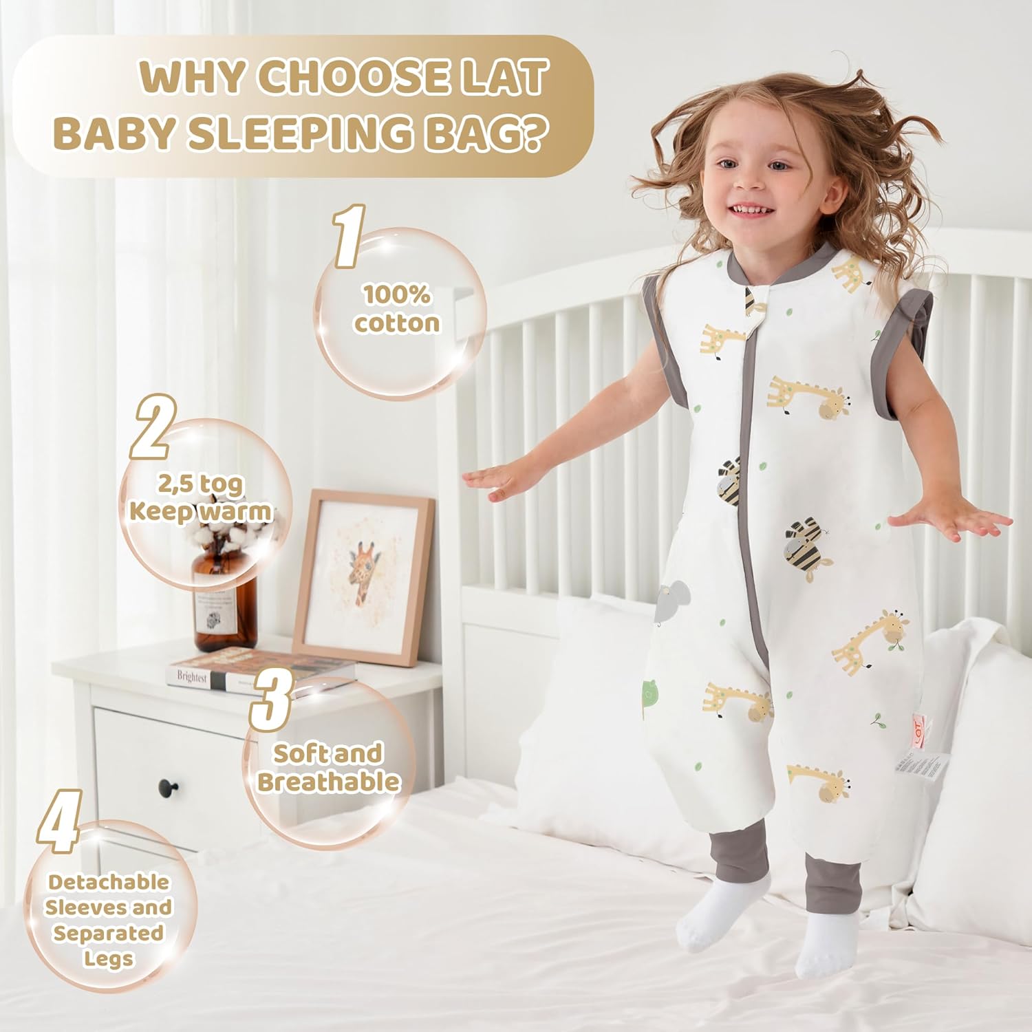 LAT Baby Sleep Bag with Feet Winter FEATHRE:Three-way zipper Wearable Blanket with Legs,for easy dressing and quick diaper changes Thicken 2.5 TOG-Sleepsuit Removable Sleeves SIZE: S (1-2T) M(2-4T) Please refer to the size chart Material:Made of organic cotton, safe and comfortable