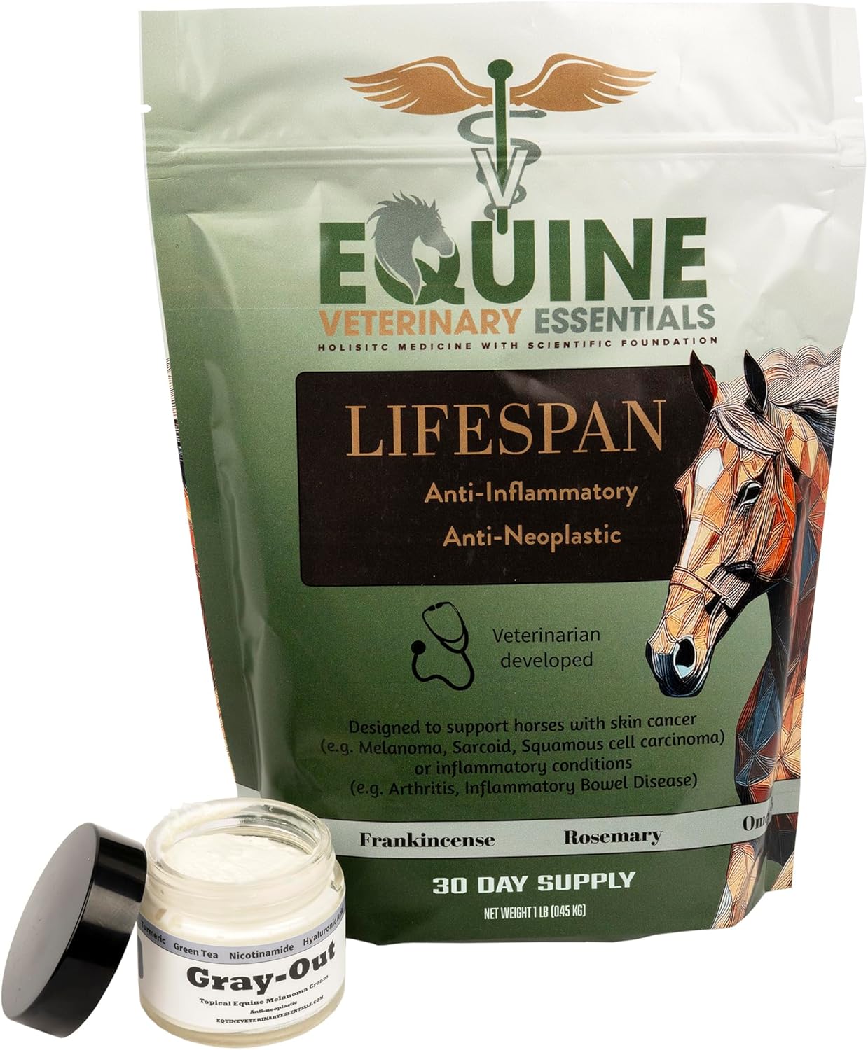 The Lifespan & Gray-Out Equine Care Bundle offers a powerful combination of internal and external support for your horse’s health. This wellness pack includes Lifespan, an herbal oral supplement designed to reduce inflammation, ease stiffness, and support mobility, along with Gray-Out, a veterinary-strength topical cream developed for grey horses and those prone to melanoma, sarcoids, and other skin blemishes. Together, they help maintain healthy joints, enhance comfort, and promote skin health—making them ideal for both performance horses and those enjoying their golden years. Convenient to use, effective in results, and designed with horse owners in mind, this bundle ensures your equine companion looks and feels their best year-round.