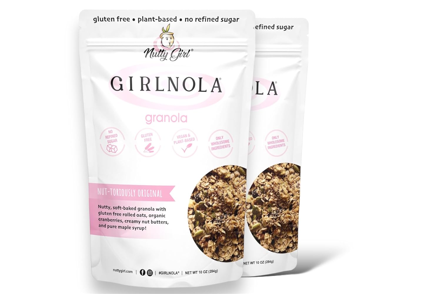 Girlnola Original is a nutty, soft-baked granola that's perfectly balanced with its wholesome blend of certified organic, gluten-free oats, nuts & seeds, creamy nut butters and pure maple syrup! Nut-toriously Original Ingredients: Certified, Gluten-free Rolled Oats, Pecans, Cashews, Raw Almond Butter, Sunflower Seed Butter, Organic Sunflower Oil, Roasted Pumpkin Seeds, Sunflower Seeds, Organic Coconut Flakes, Golden Flax Seed, Chia Seed, Pure Maple Syrup, Apple Juice-Infused Cranberries, Coconut Sugar, Ground Cinnamon, Himalayan Sea Salt