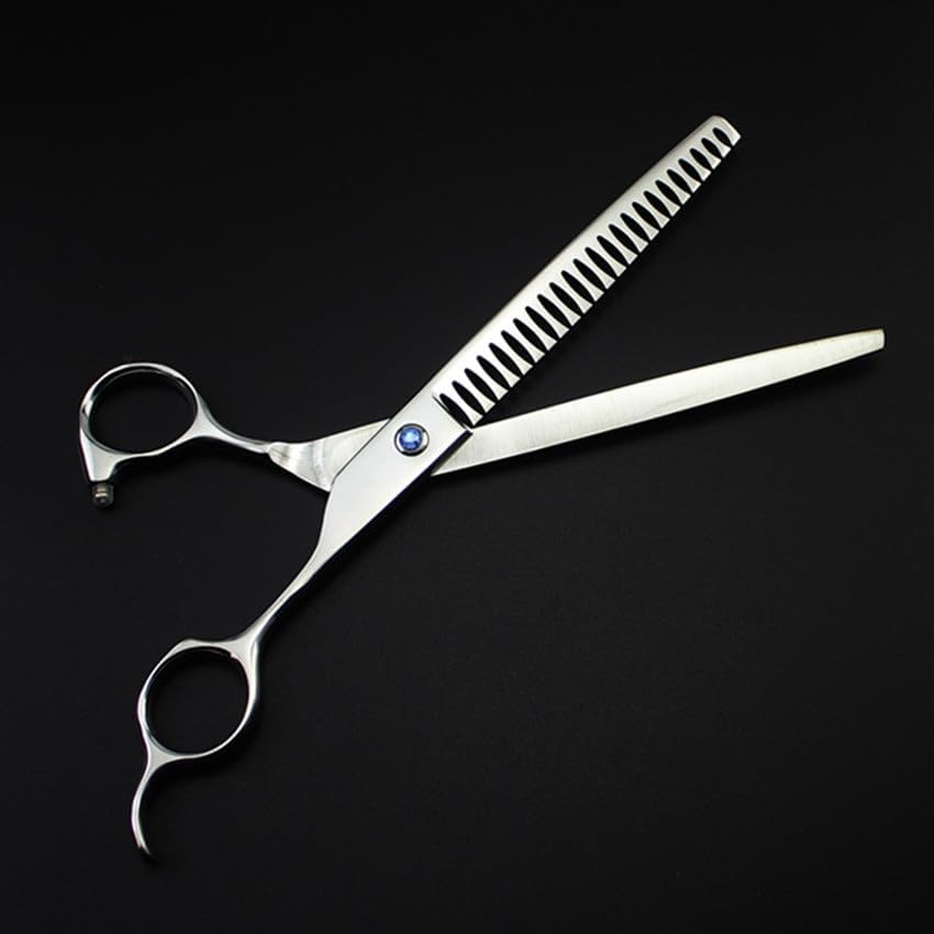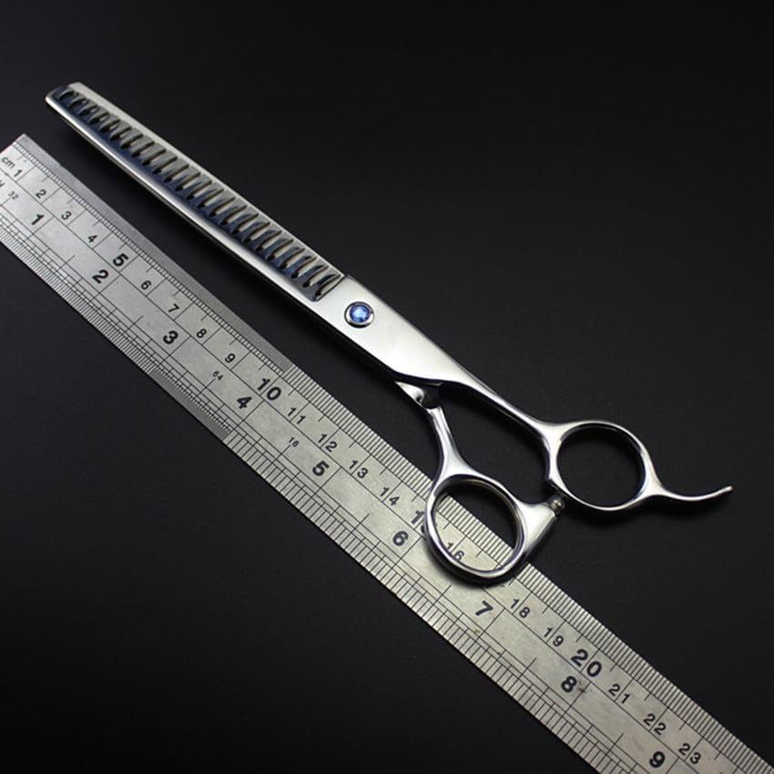 Professional high quality japan 440c steel 7.5 inch pet dog grooming cut hair scissors thinning scissors salon shears haircut berber tools hairdressing scissors Material: Japan 440c steel Hardness: 62HRC Technology: Handmade Type: Thinning scissors Thinning rate : 45% Size: 7.5 inch Length : 20.5 cm Don't include the bag